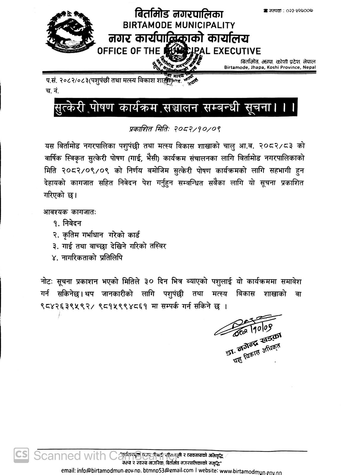 मिति २०८२-१०-१५ गते प्रकाशित गाई/भैंसीमा बाझोपना निवारण शिविर सञ्चालन सम्बन्धी सूचना ।