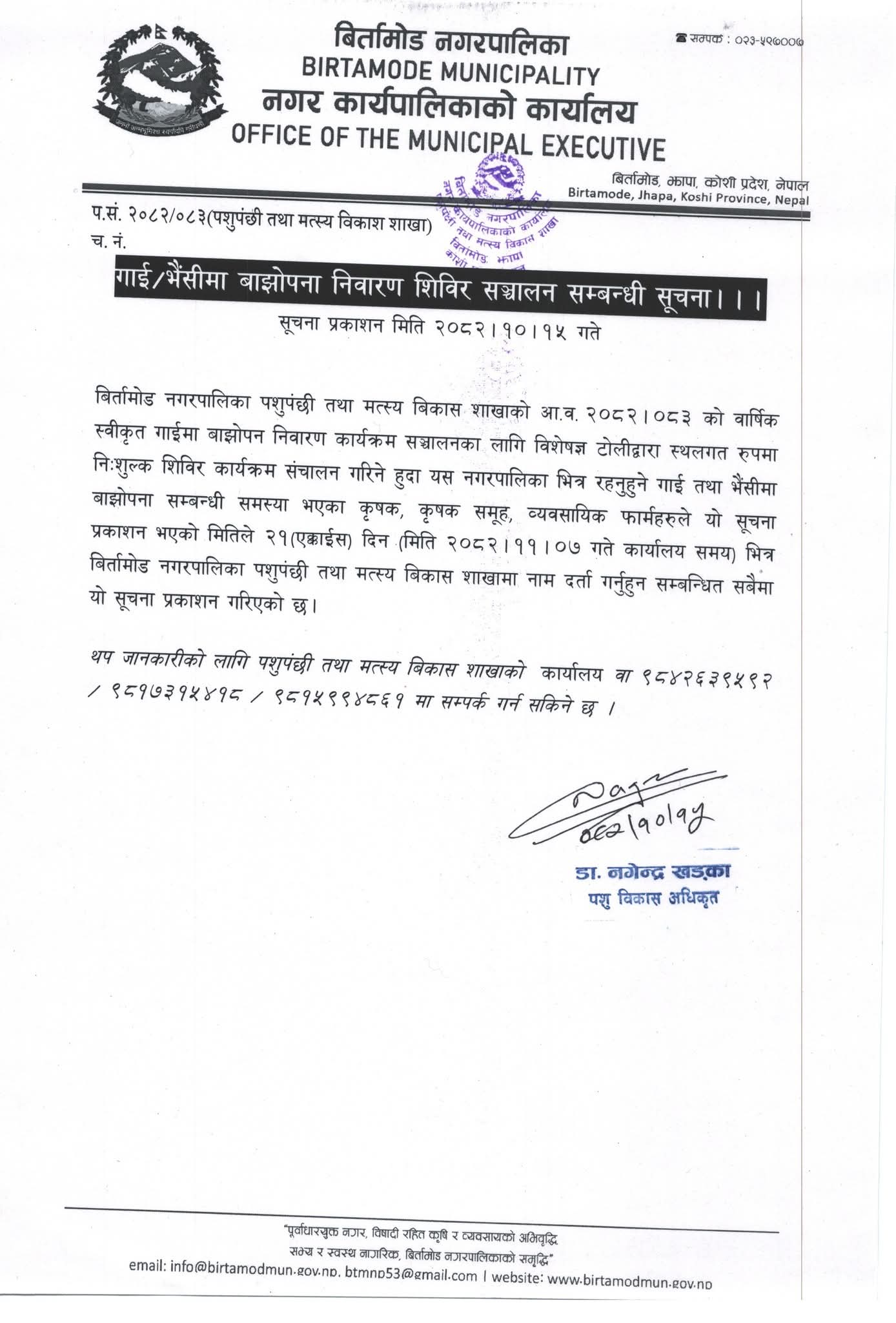 मिति २०८२-१०-१५ गते प्रकाशित गाई/भैंसीमा बाझोपना निवारण शिविर सञ्चालन सम्बन्धी सूचना ।