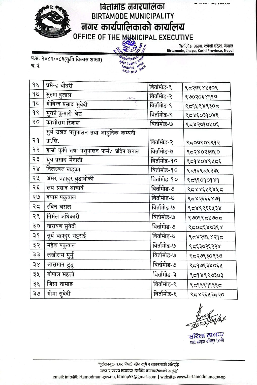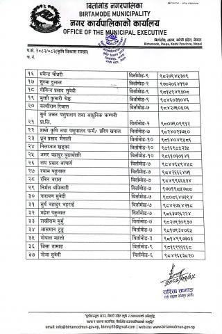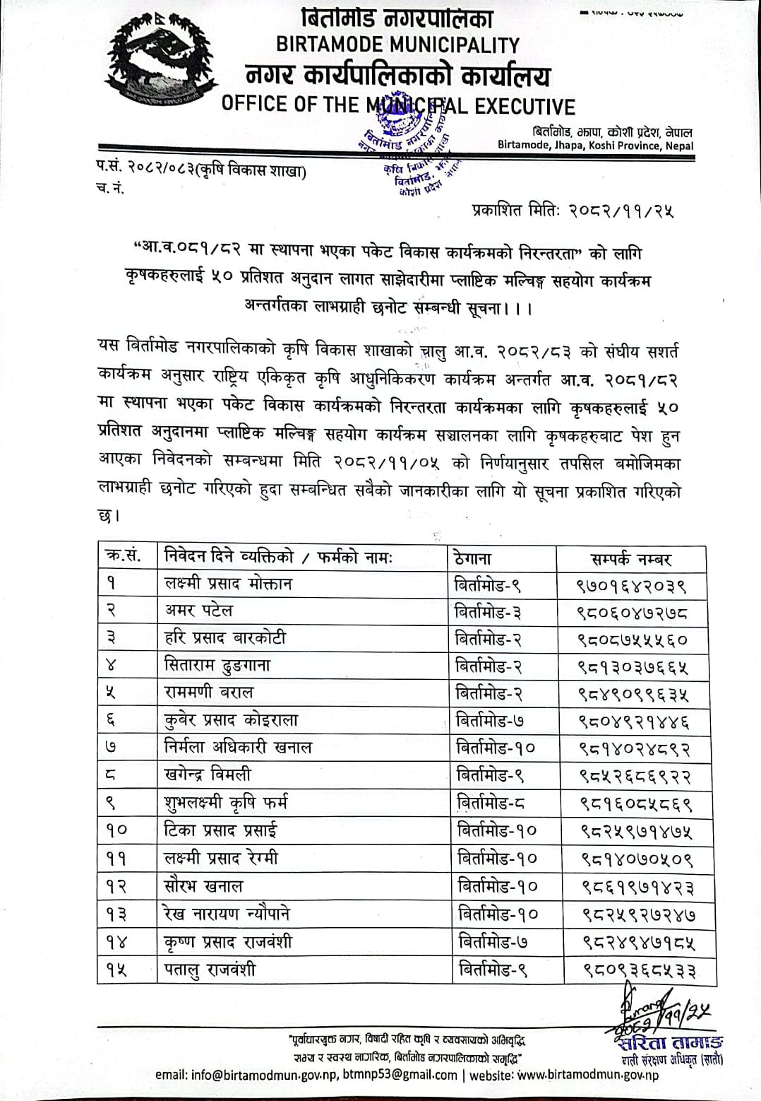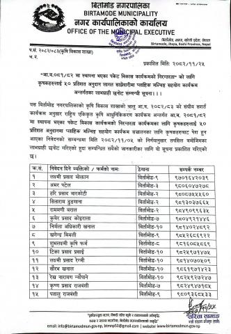 मिति २०८२-११-२५ गते प्रकाशित "आ.व. ०८१/०८२ मा स्थापना भएका पकेट विकास कार्यक्रमको निरन्तरता " को लागि कृषकहरुलाई ५० प्रतिशत अनुदान लागत साझेदारीमा प्लाष्टिक मल्चिग्ङ सहयोग कार्यक्रम अन्तर्गतामा लाभग्राही छनौट सम्बन्धी सूचना ।