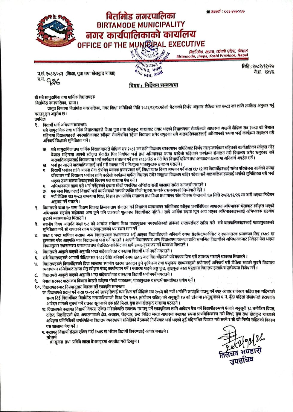मिति २०८२-१२-२७ गते प्रकाशित संस्थागत विद्यालयहरुलाई निर्देशन सम्बन्धी सूचना ।