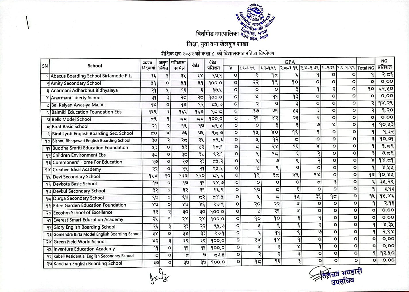 शैक्षिक सत्र २०८२ को कक्षा ८ को विद्यालयगत नतिजा विष्लेषण ।