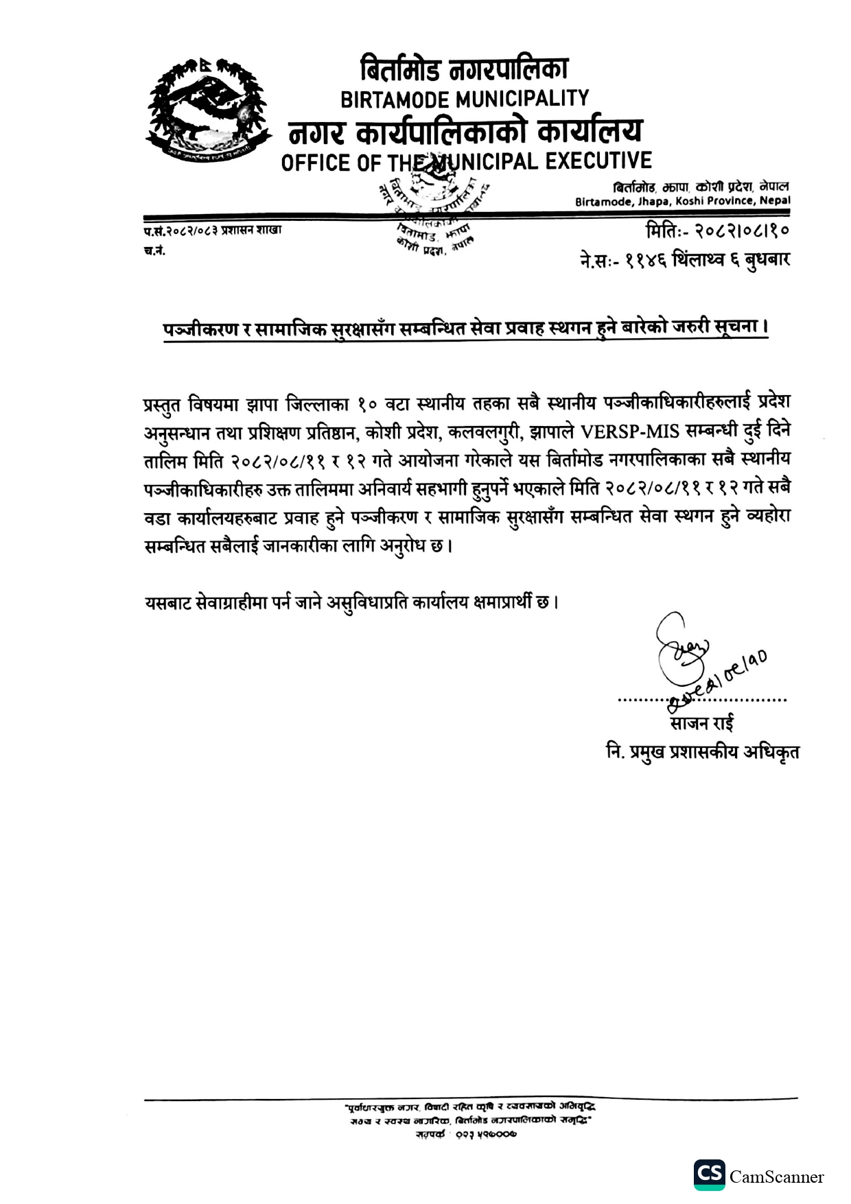 मिति २०८२-०८-१० गते प्रकाशित पञ्जीकरण र सामाजिक सुरक्षासँग सम्बन्धित सेवा प्रवाह स्थगन हुने बारेको जरुरी सूचना ।