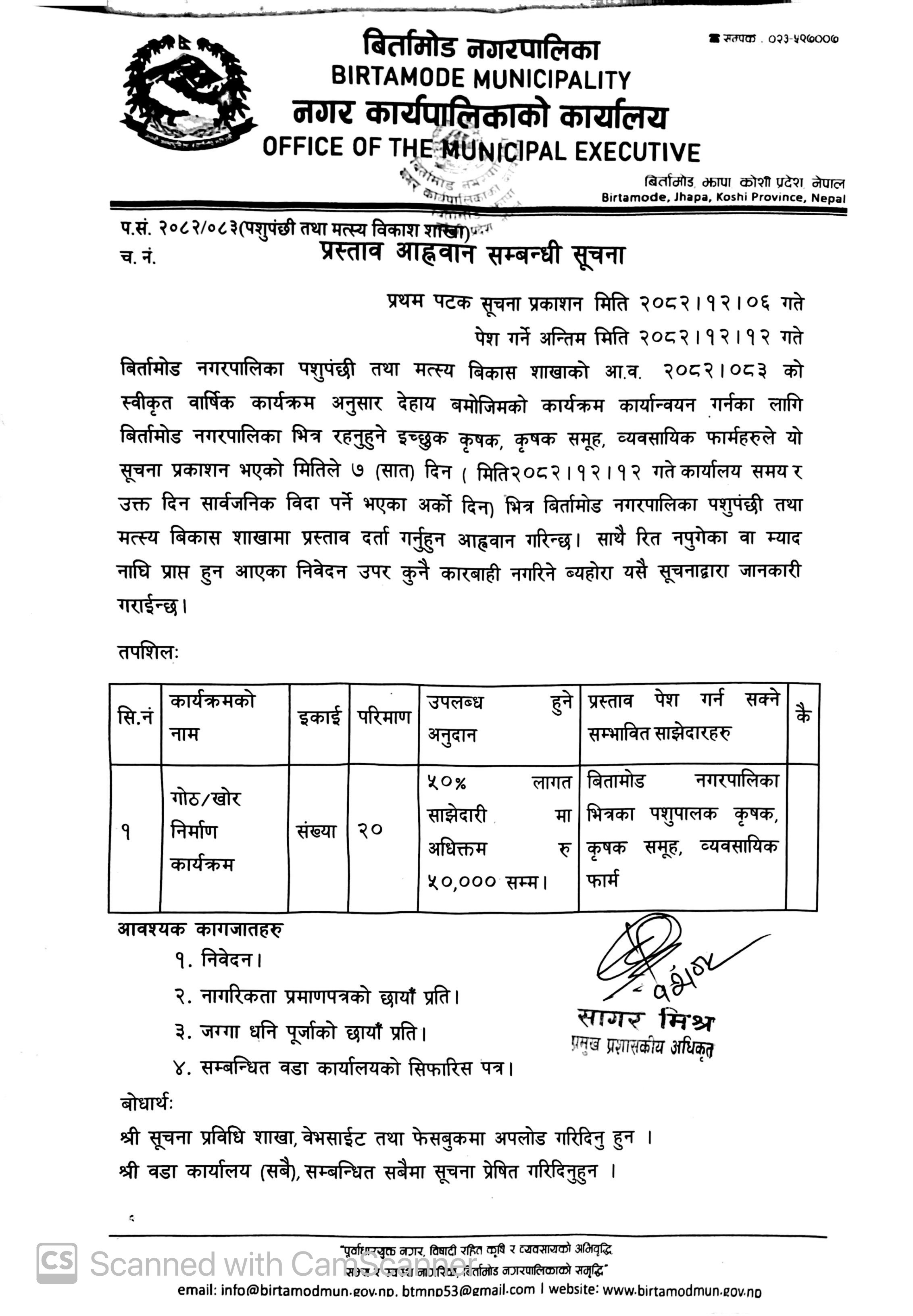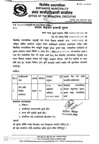 मिति २०८२-११-२८ गते प्रकाशित कृषि विकास शाखा अन्तर्गत प्रस्ताव आह्नवान सम्बन्धी सूचना ।