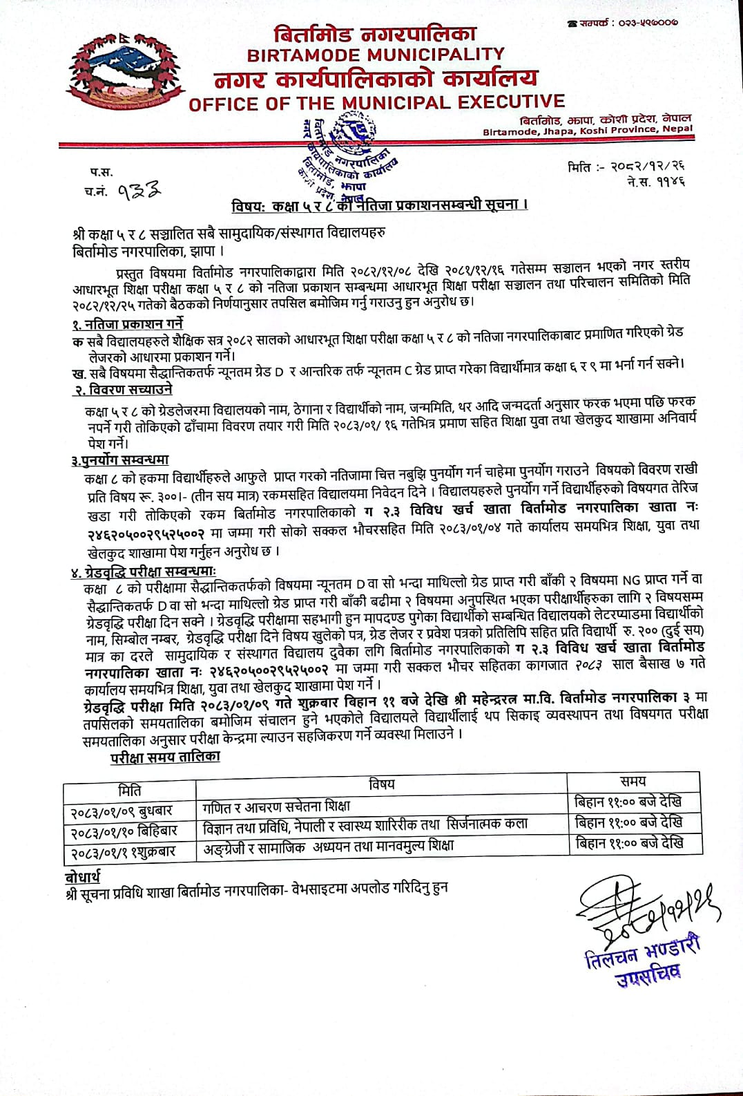 मिति २०८२-१२-२६ गते प्रकाशित कक्षा ५ र ८ को नतिजा प्रकाशन सम्बन्धी सूचना ।