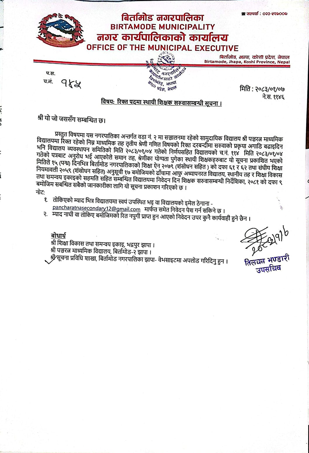 मिति २०८३-०१-०७ मा प्रकाशित रिक्त पदमा स्थायी शिक्षक सरुवासम्बन्धी सूचना ।