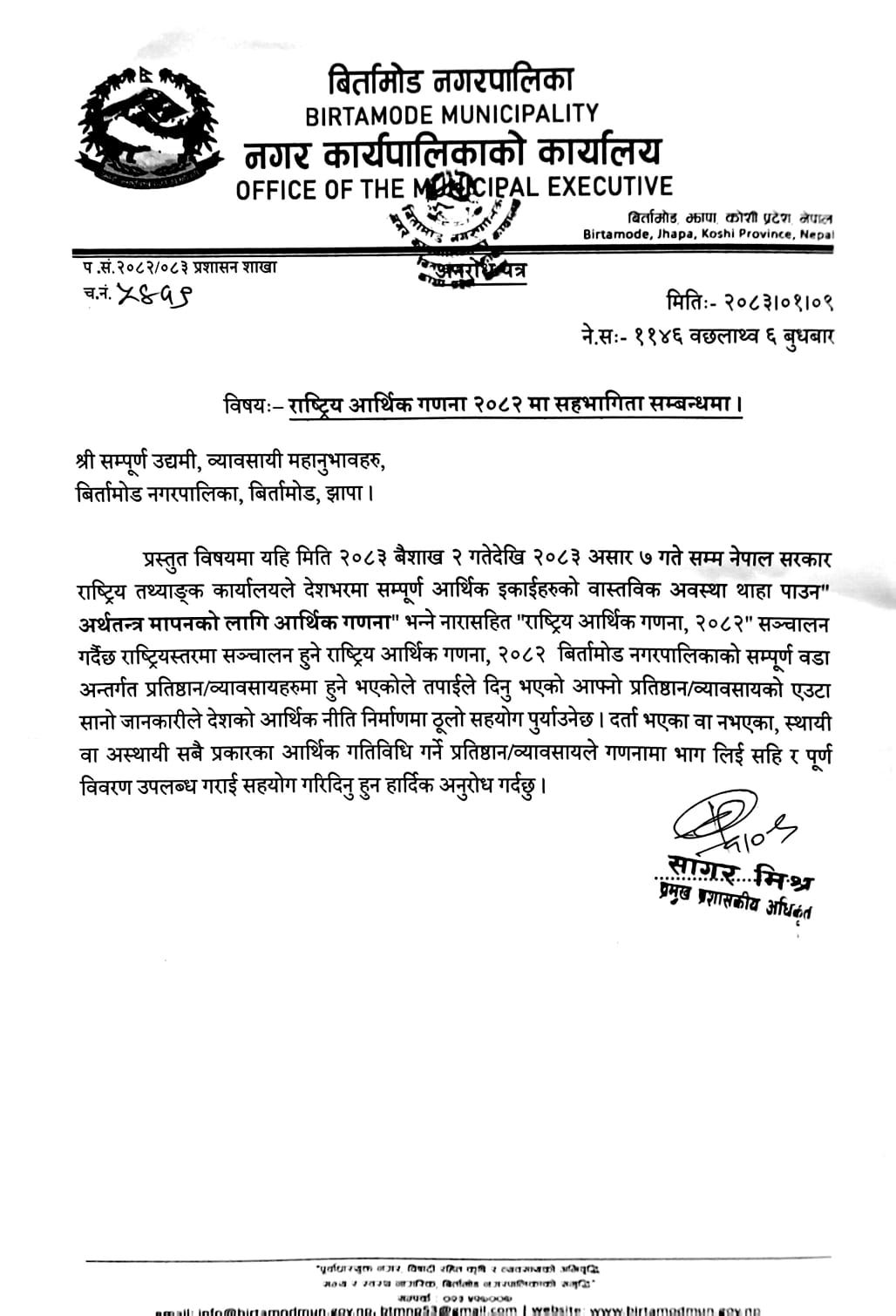 मिति २०८३-०१-०९ गते प्रकाशित राष्ट्रिय आर्थिक गणना २०८२ मा सहभागिता सम्बन्धी सूचना ।